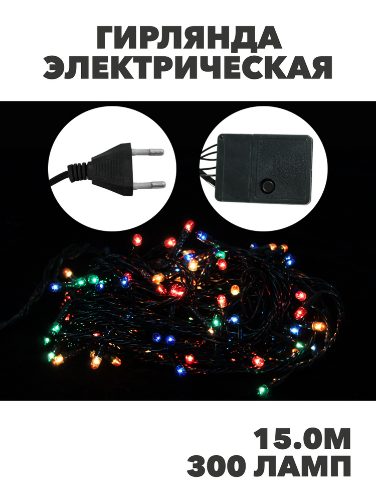 Гирлянда электрическая Там Там 15.0м 300 ламп кабель зеленый мультиколор с контроллером, y3050303423