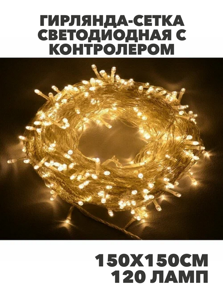 Гирлянда-сетка светодиодная с контролером 150х150см 120 ламп теплый белый, y3050303418