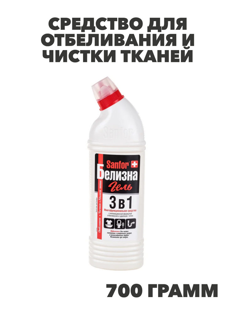 Белизна гель 3 в 1 от Sanfor 700г - универсальная жидкость для профессионального (отели, офисы, торговые центры, детские и медицинские учреждения) и домашнего использования (сантехника, ванна, санузел, туалет, душевые кабины, кухня, стоки, сливные отверстия, мытье плитки).