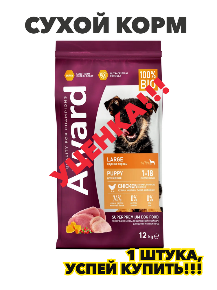 Сухой корм AWARD для щенков от 1 месяца крупных пород с курицей и индейкой с добавлением тыквы и шиповника 12 кг.