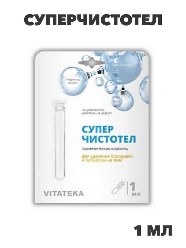 Косметическая жидкость Vitateka Суперчистотел 1 мл. Средство для борьбы с косметическими дефектами кожного покрова: бородавками, папилломами, сухими мозолями, натоптышами. Активные вещества в составе способствуют избавлению от несовершенств кожи за счет выраженного прижигающего действия. Применять только для участков с избыточным ороговением!