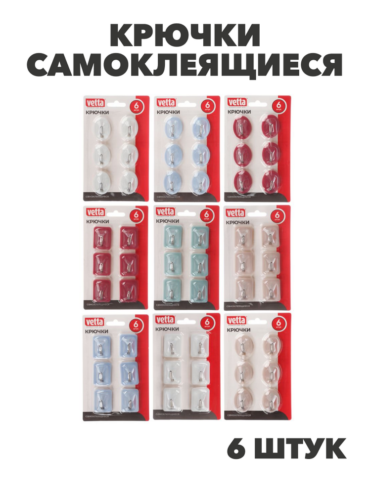 VETTA Крючки самоклеящиеся на блистере, 6шт, 5 цветов, WF-104, n3715-gl-440-108