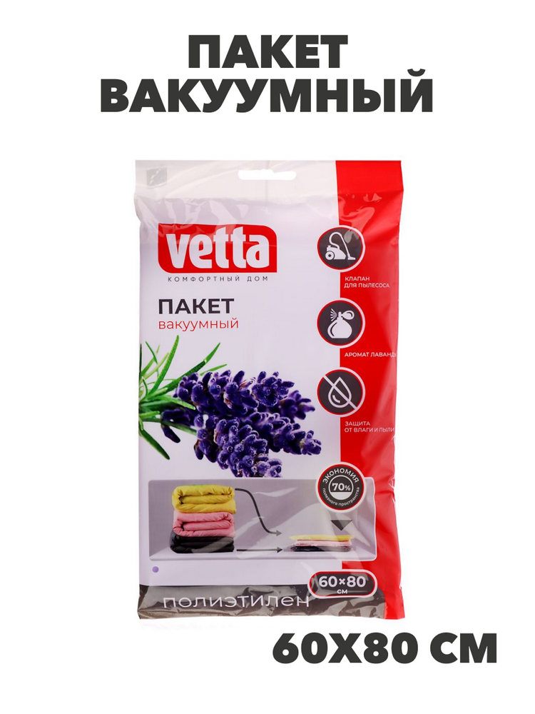 Вакуумный пакет VETTA предназначен для эффективной организации пространства в шкафах и комодах. Он позволяет значительно сэкономить место, удаляя воздух из сложенных вещей, таких как одеяла, подушки, сезонная одежда и мягкие игрушки. Главная особенность этой модели – наличие встроенного ароматизатора с запахом лаванды, который, по отзывам покупателей, помогает избежать неприятного запаха полиэтилена и придает вещам свежесть. Пакет оснащен специальным клапаном, через который воздух откачивается с помощью обычного пылесоса, и надежной застежкой.